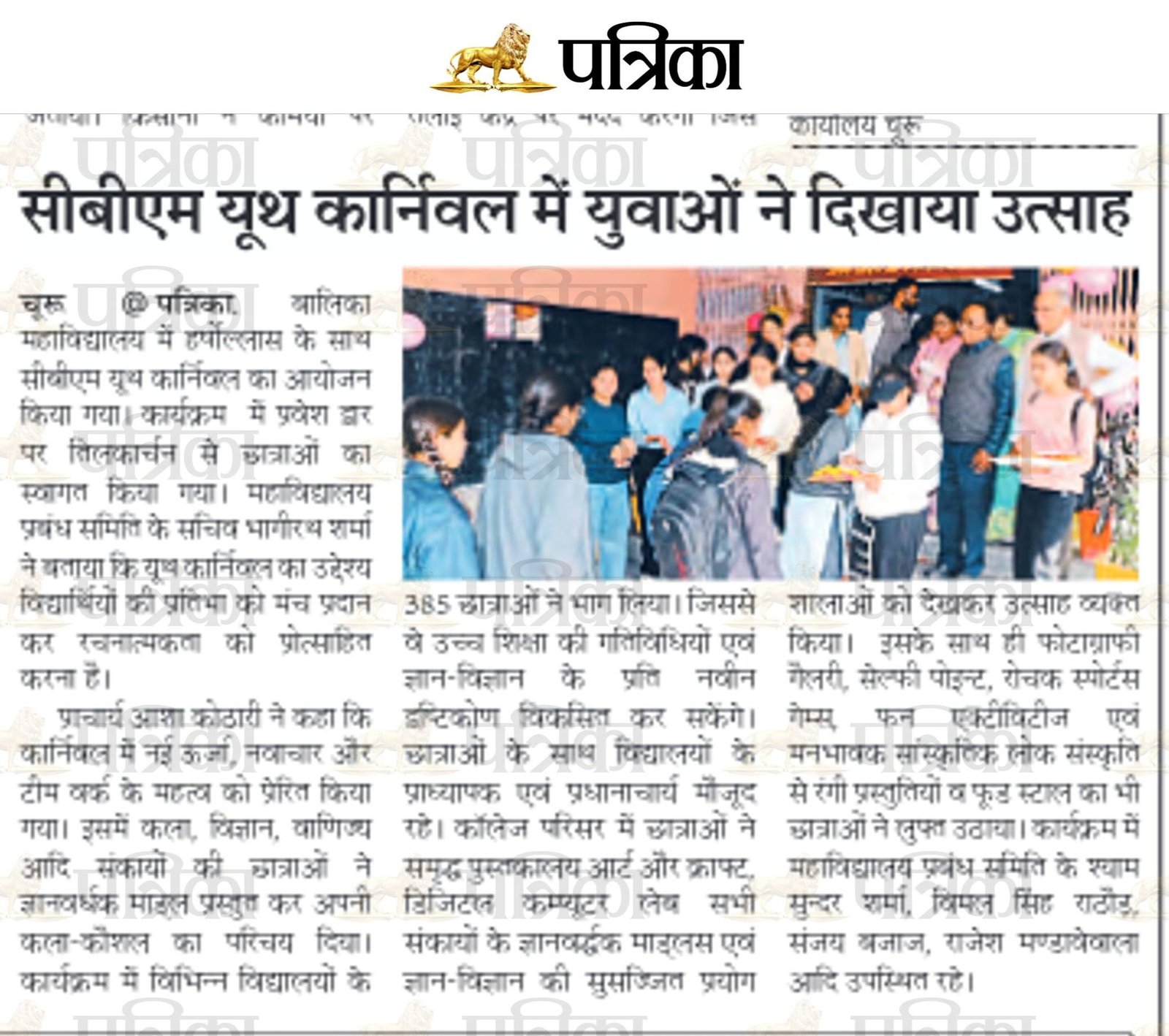परिक्रमा, संवाद, सहभागिता और सहकार के साथ आनन्द! सचमुच 4 दिसम्बर का दिन चूरू बालिका महाविद्यालय में आनन्दोत्सव में बदल गया। चूरू की विभिन्न स्कूलों की सीनियर सैकंडरी की सैकड़ों छात्राओं ने तिलकार्चन के बाद कॉलेज और इसकी गतिविधियों का अवलोकन किया, प्रयोगधर्मी प्रदर्शनी को देखा, मनोरंजक खेलों में हिस्सा लिया, लोकधुनों पर थिरकीं तो किसी सेल्फी पॉइंट पर कैमरा क्लिक…। ऐसी कितनी ही मनोरम गतिविधियाँ और अंत में स्टॉलों पर स्नैक्स का लुत्फ़!